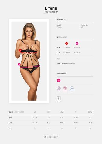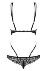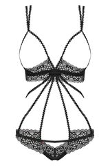 Страстное боди с открытой грудью и промежностью для горячей ночи. Изготовлено из кружева с цветочным орнаментом и тонких эластичных тесемок. Двойные бретели регулируются по длине, сзади застежка на крючок. Декоративные украшения с маленькими кристаллами украшают боди на спинке.