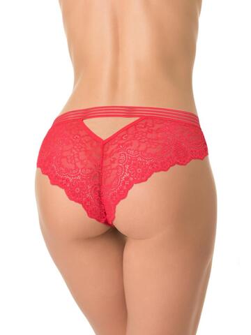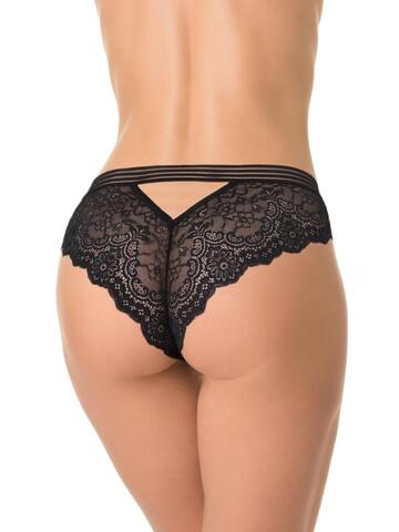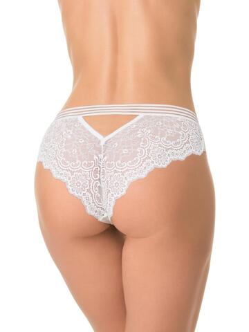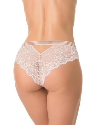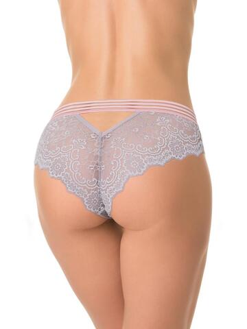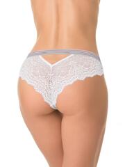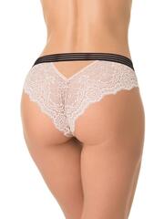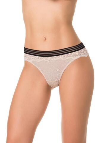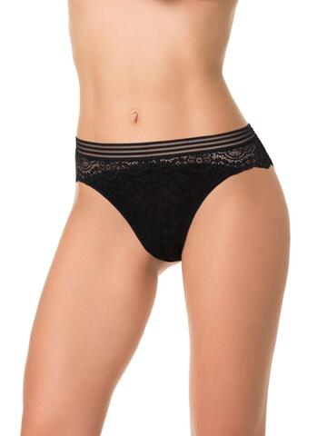 Трусы-бразилиана со средней линией талии, выполнены из кружева. Передняя деталь продублирована изнутри сетчатым полотном. Контрастная широкая декоративная резинка, использованная для обработки талии, придает изделию ультрамодное звучание. Хлопковая ластовица.