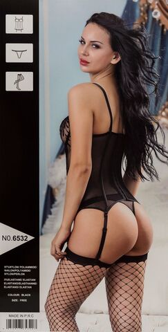 Удивите партнера новым романтичным обликом. Его можно использовать во время совместной ролевой игры с различными увлекательными сценариями. Корсаж подчеркивает стройность фигуры и эффектно маскирует недостатки, он помогает привлечь взгляд к пышной груди. Корсаж с бретелями демонстрирует красоту плеч и привлекает внимание к зоне декольте, он дополнен пояском, подчеркивающим талию. В комплект входят трусики с аналогичным узором и чулки в сеточку с пажами. В комплекте: корсаж, трусики-стринги и чулки.