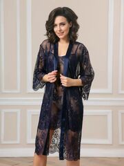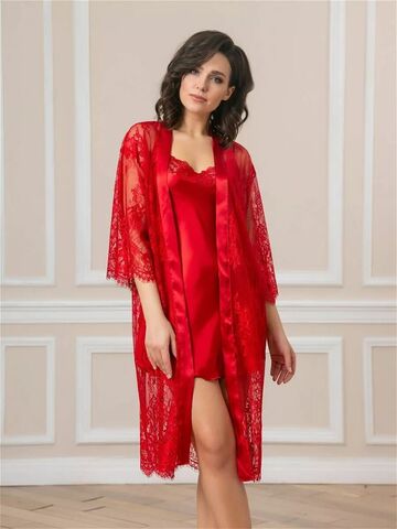 Короткий халат на запах из кружева с поясом, декорированный атласом по борту.