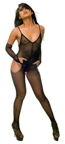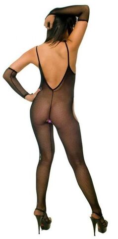 Комплект для женщин, состоящий из кэтсьюита с вырезами на бедрах и интимных местах. Тонкие бретели, глубокий вырез на спине. В комплекте высокие перчатки выше локтя, с петлей на средний палец. В комплекте: кэтсьюит, перчатки.