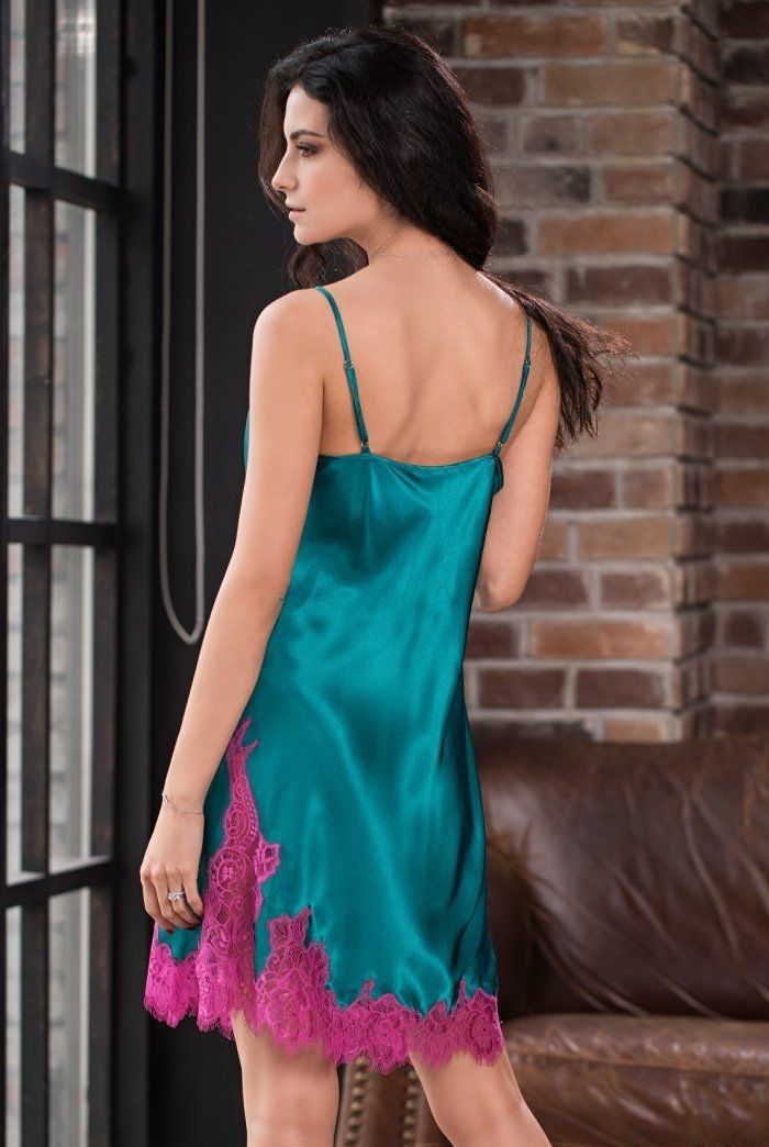 Короткая сорочка Bella на тонких бретелях с подрезом под грудью из смесового шелкового полотна. Лиф и низ изделия декорированы кружевом. Полотно вырезано четко по форме кружева, огибая каждый завиток, что придает модели особый шик.