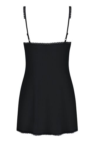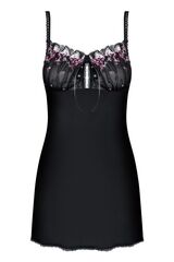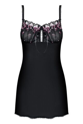 Сорочка из стрейч-атласного материала, верх сорочки выполнен из полупрозрачного материала, украшен вышивкой. В комплект входят трусики. В комплекте: сорочка, трусики-стринги.