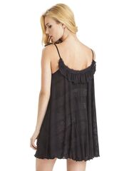 Короткая сорочка на тонких бретелях из полупрозрачной ткани. Приталенный силуэт формируют рельефные швы. Вырез горловины обработан узким черным кружевом, которое переходит и на бретели.
