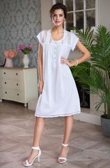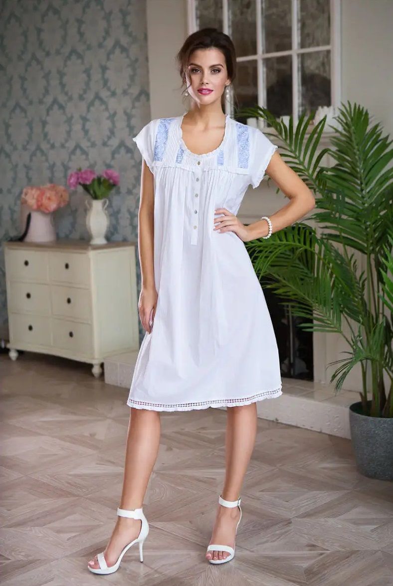 Сорочка свободного силуэта с коротким рукавом, выполнена из хлопка с декором в виде вышивки на кокетке - золотистого или голубого цвета. На полочке расположена застежка-планка на перламутровых пуговицах. Кокетка полочки украшена вертикальными отстроченными защипами. Низ кокетки подчеркнут узкой рюшей. Спинка на кокетке, нижняя часть спинки со сборкой. Вырез горловины, низ изделия и рукавов оформлен узкой рюшей.