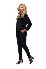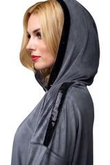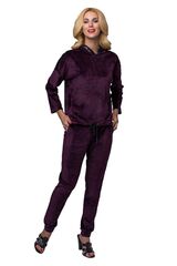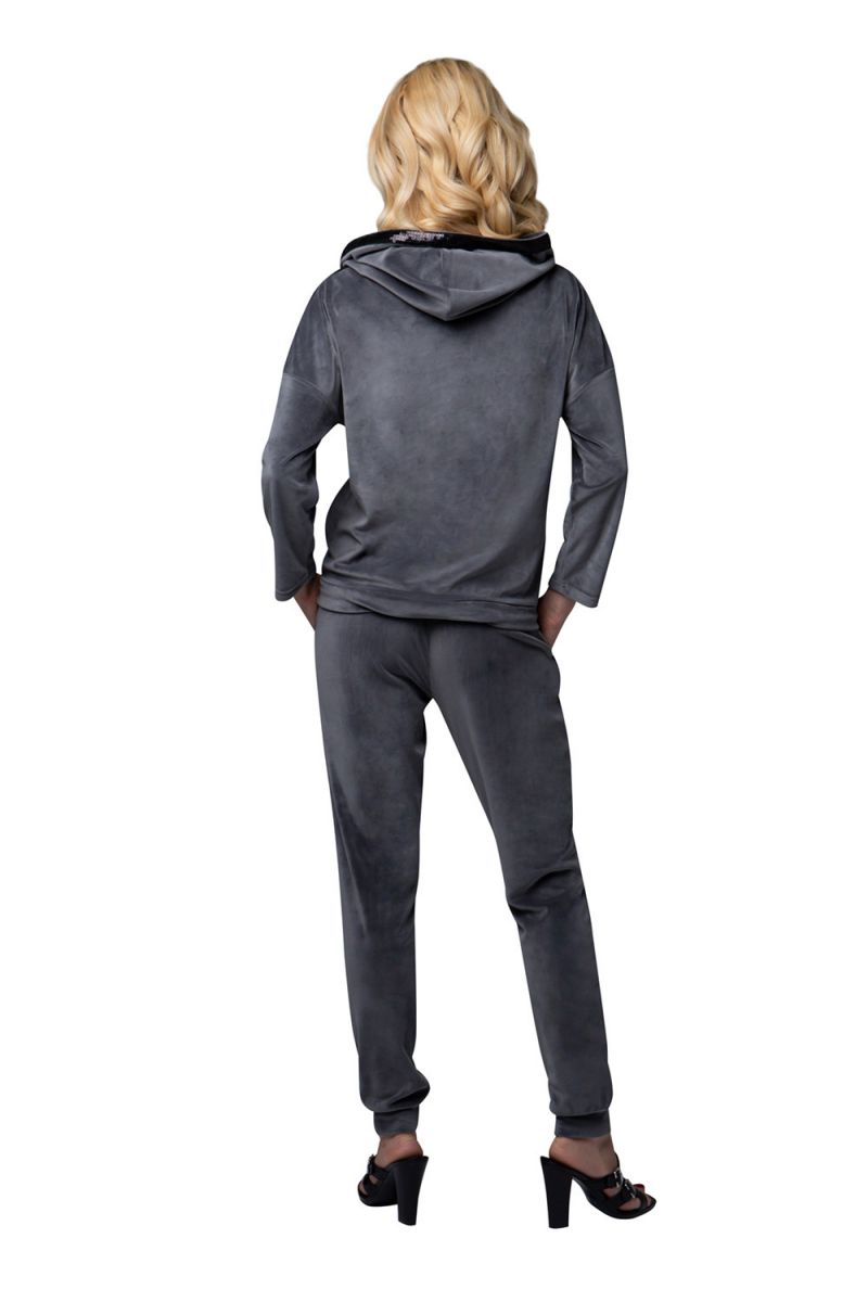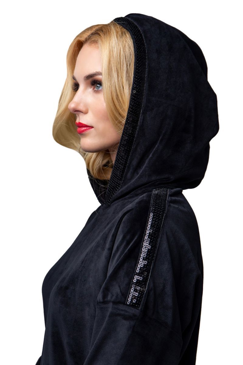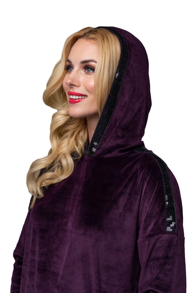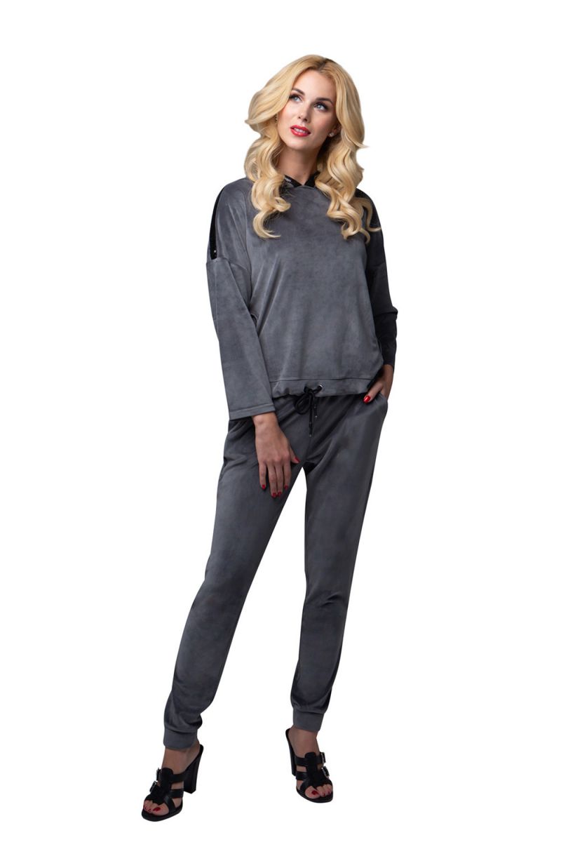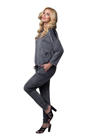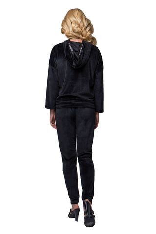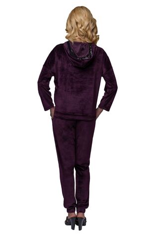 Изысканный женский костюм свободного кроя из мягкого бархатного материала. Куртка с боковыми карманами. Капюшон и линия плеча декорированы лентой из пайеток. По низу куртки продета кулиска, позволяющая её моделировать. Брюки свободные, на манжетах, с удобными карманами. Костюм подходит для дома и активного отдыха. В комплекте: куртка и брюки.