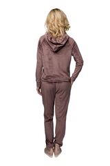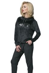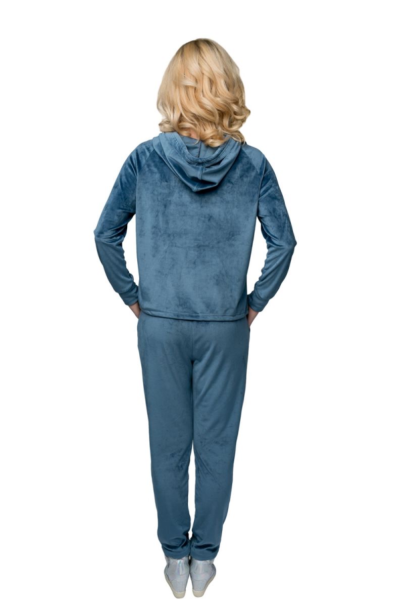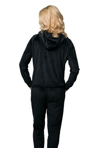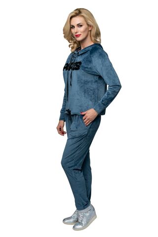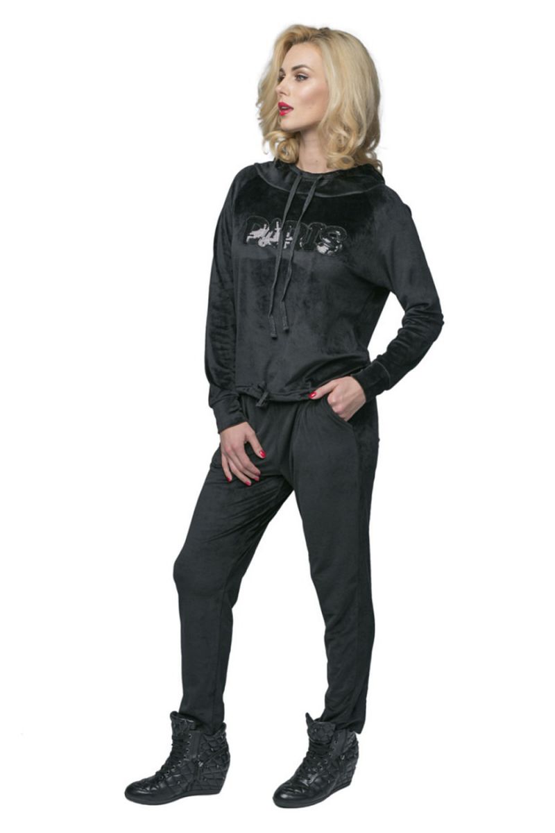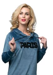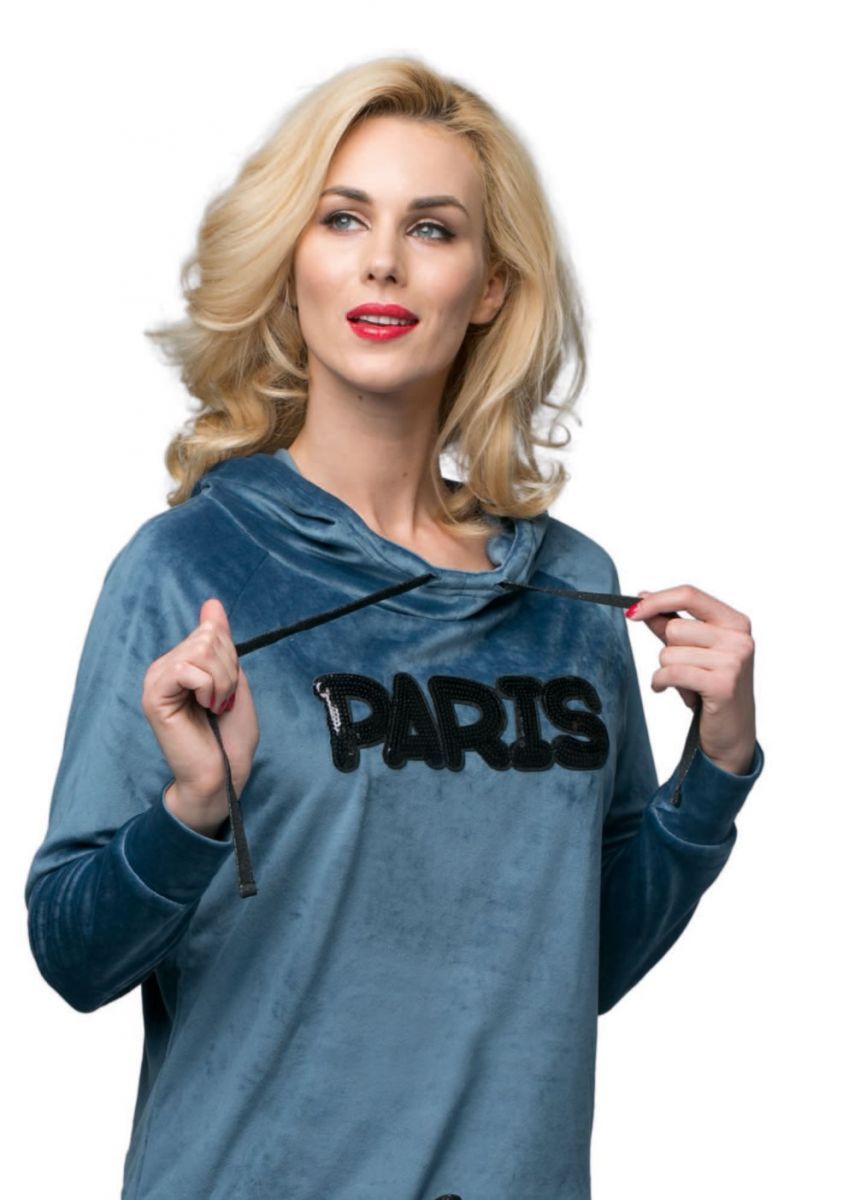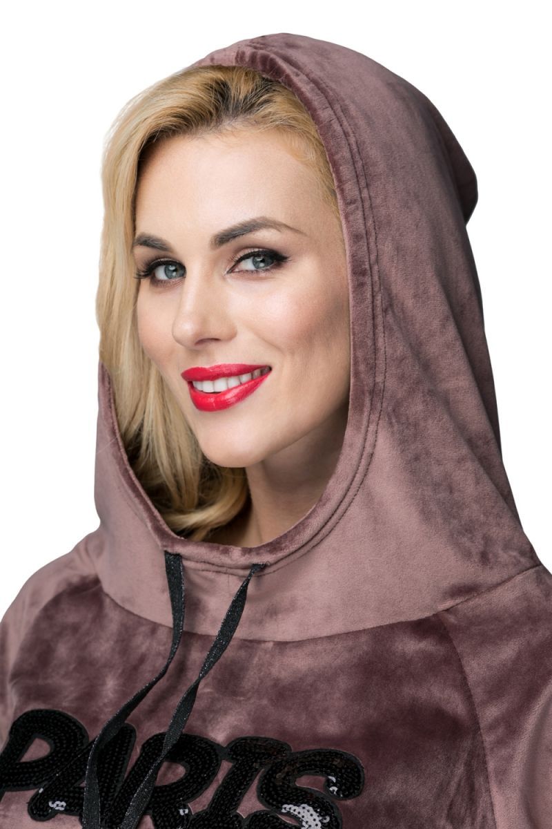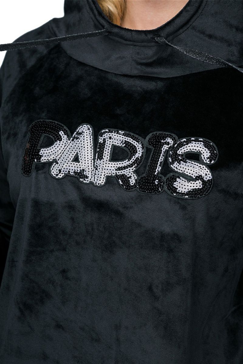 Уютный костюм, с длинными рукавами с манжетами, капюшоном с завязкой. Топ украшен аппликацией PARIS из пайеток. По низу топа продет шнур, регулирующий объем в талии. Брючки с карманами. В комплекте: топ и брючки.