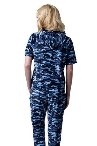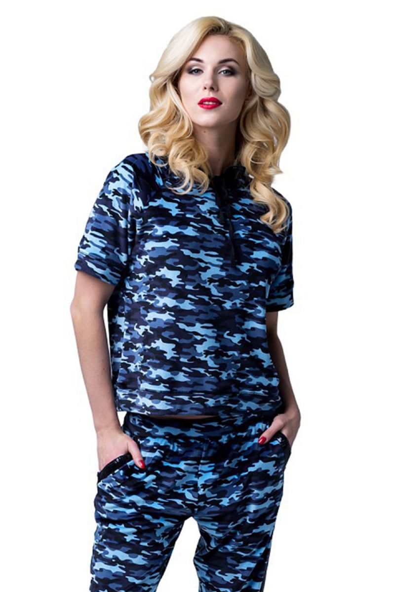 Домашний костюм в стиле cпорт шик. Топ с коротким рукавом и капюшоном, украшенный лентой из пайеток. Брючки с втачными карманами на манжете с боковыми лампасами из ленты с пайетками. В комплекте: топ и брючки.