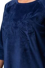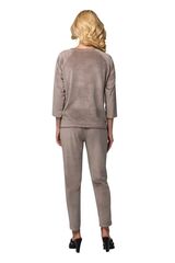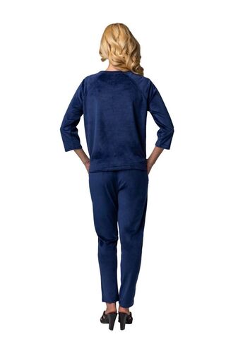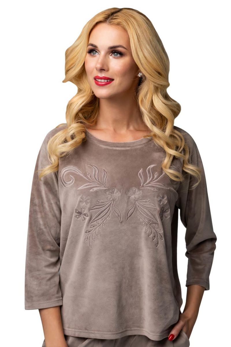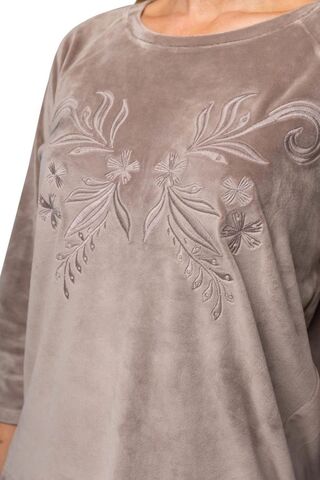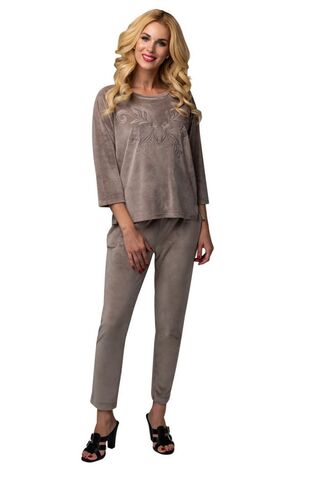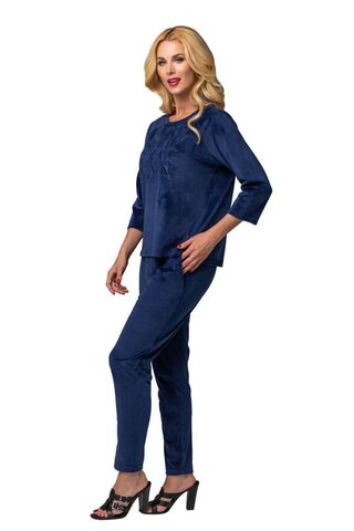 Элегантный женский костюм свободного кроя из мягкого бархатного материала. Свитшот с рукавами реглан декорирован объёмной вышивкой. Брюки - средней посадки, заужены книзу, с боковыми карманами. Костюм подходит для дома и активного отдыха. В комплекте: свитшот и брюки.