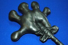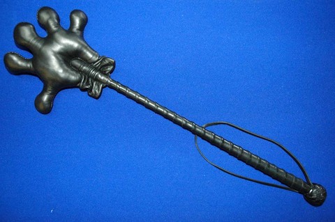 Витой стержень на конусе с ограничителем – плетенной бобышкой – и петлей снизу, с черной насадкой стилизованной под мультяшную ладошку в перчатке.
