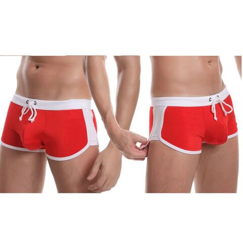 Стильные красные мужские плавки с контрастным белым поясом.