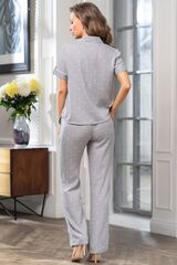 Комплект состоит из жакета с коротким рукавом и брюк. Выполнен из тканой принтованной вискозы с отделкой в виде контрастных кантов. На верхней левой части полочки жакета расположен накладной карман. По бокам брюк обработаны карманы. В комплекте: жакет, брюки.