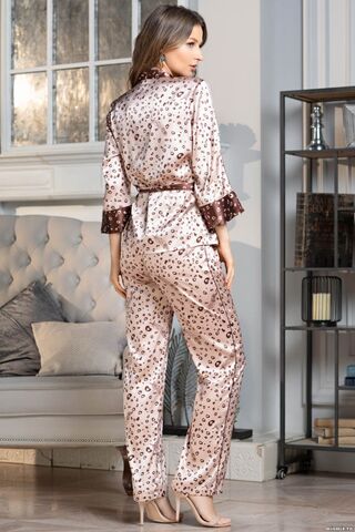 Комплект тройка состоит из запашного жакета с рукавом длиной 3/4, брюк и топа на тонких бретелях. Комплект выполнен из двух видов принтованного искусственного шелка с блеском. По бокам брюк обработаны карманы. Линию талии можно подчеркнуть за счет пояса, который идет в комплекте. В комплекте: жакет, брюки, топ.