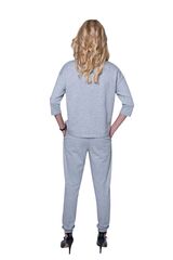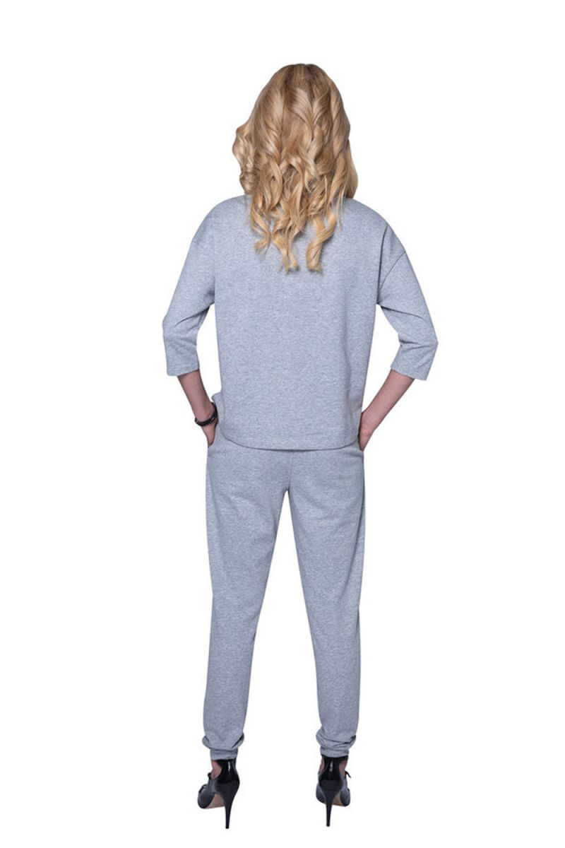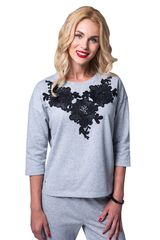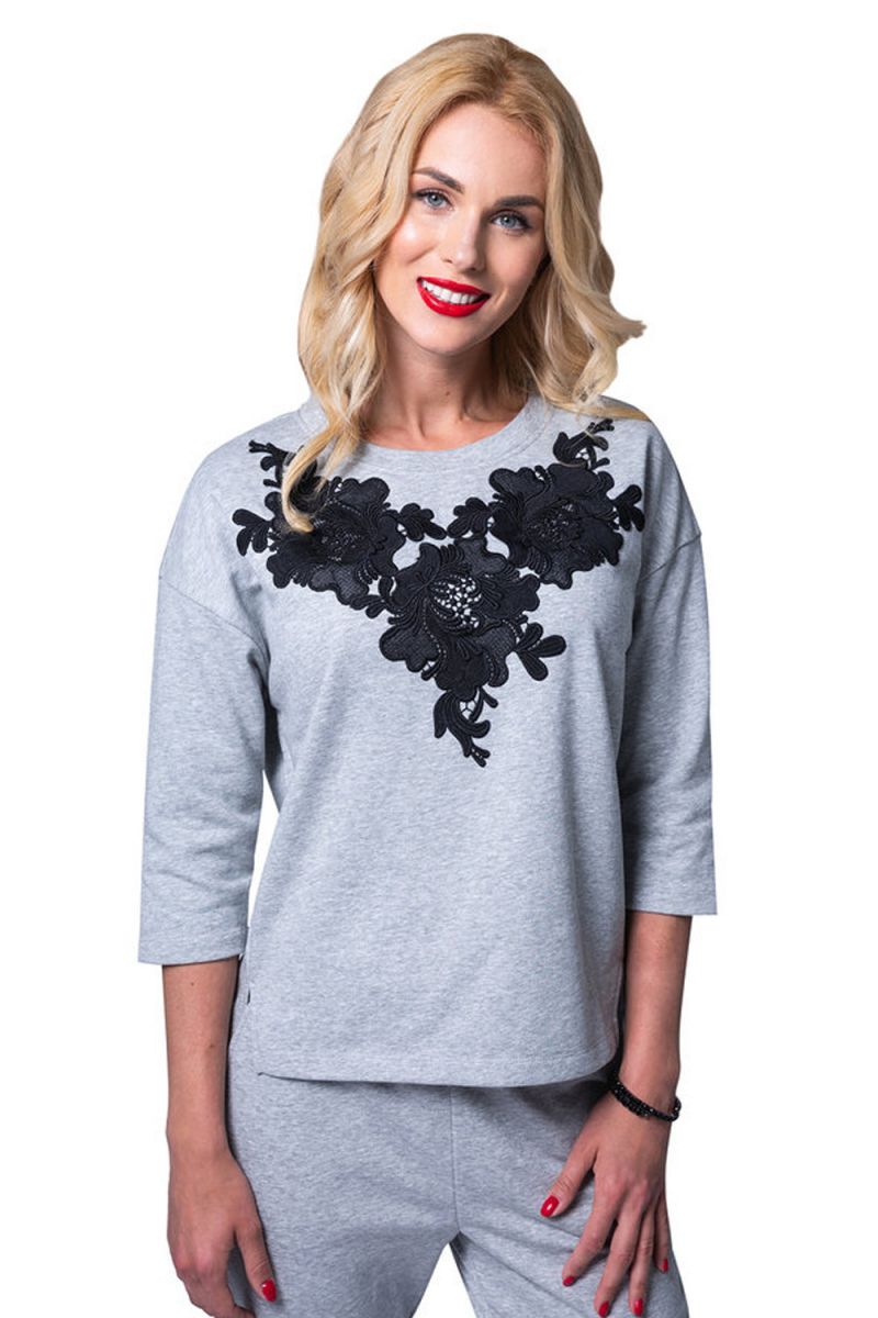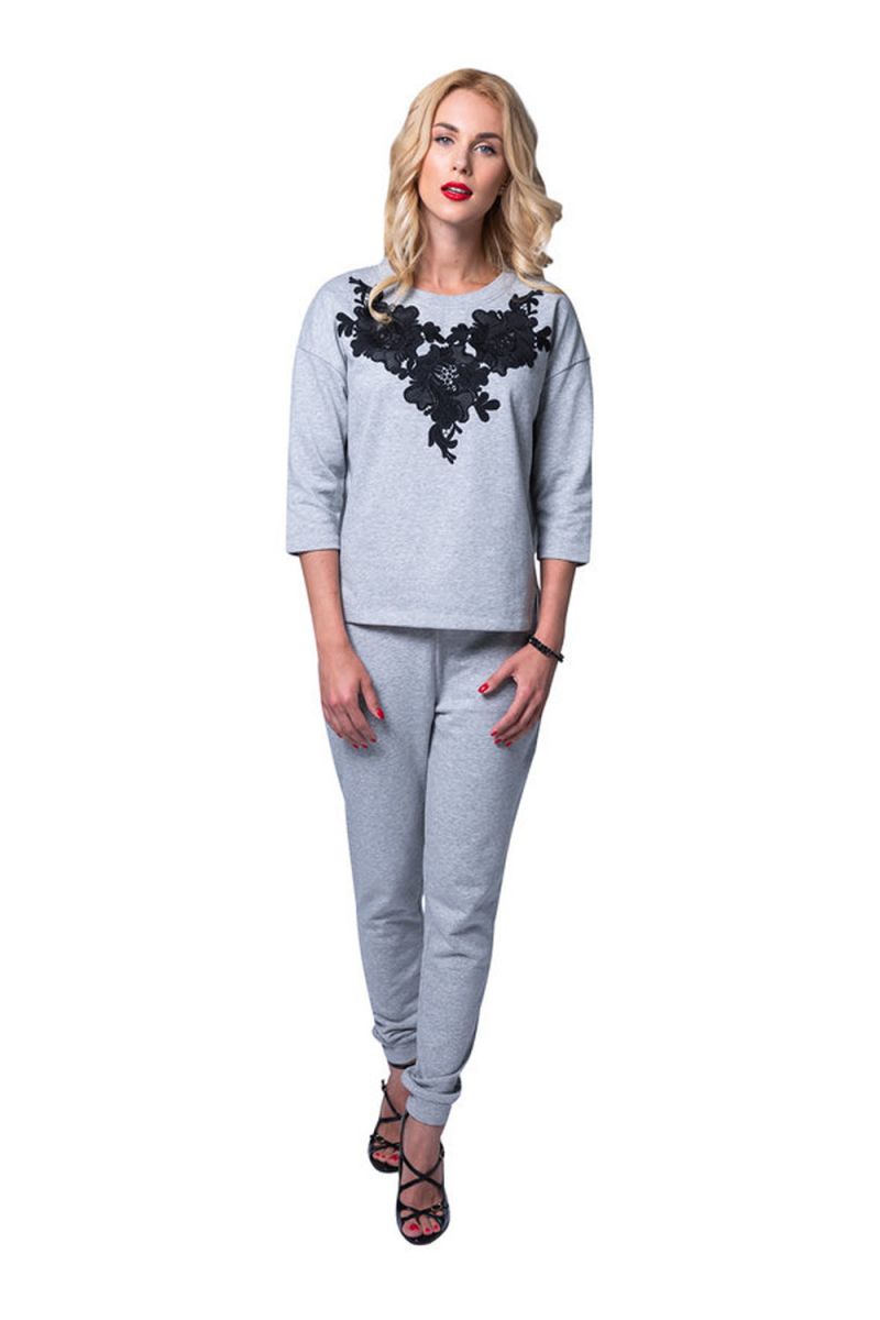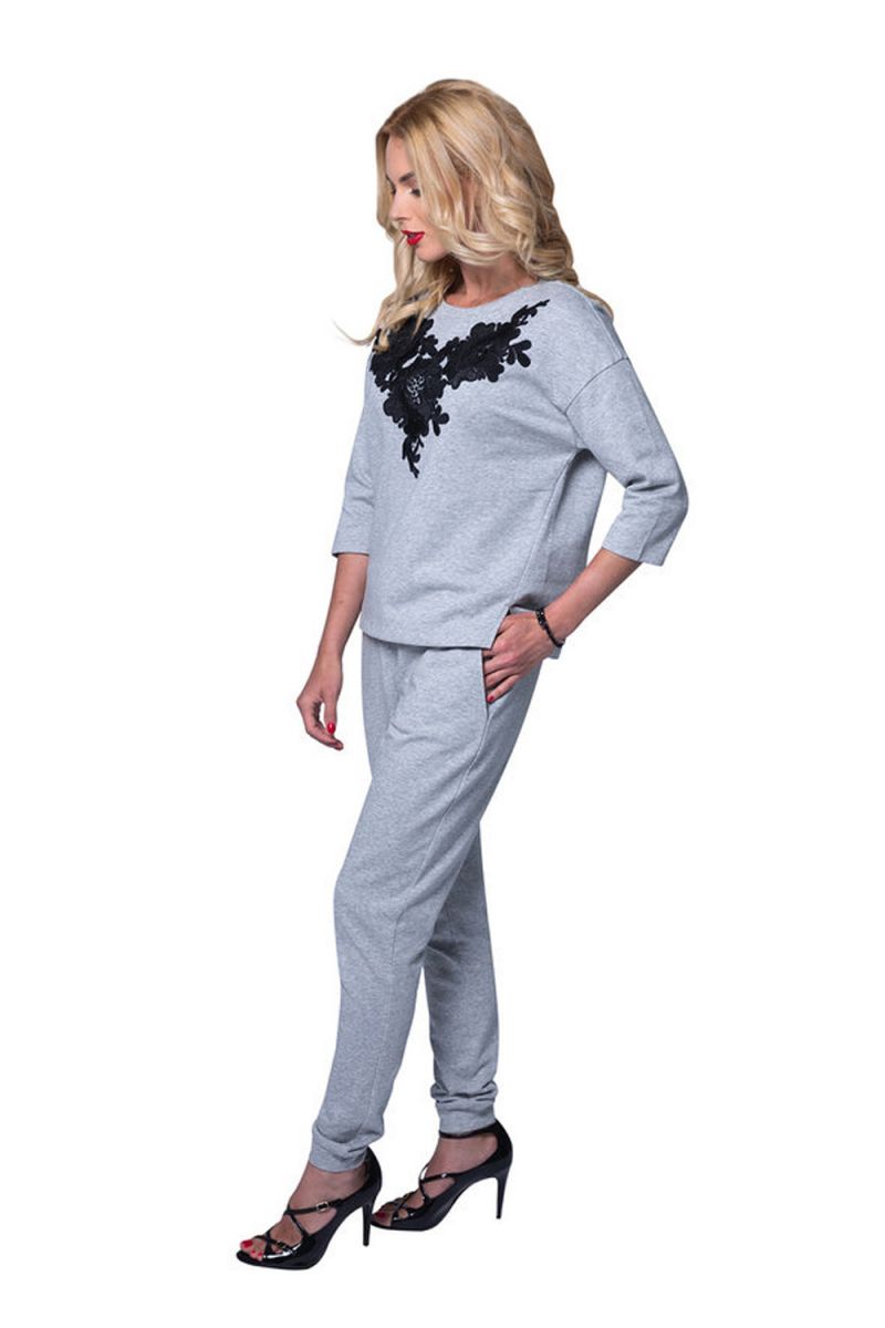 Стильный женский костюм свободного кроя. Свитшот модного силуэта с боковыми разрезами декорирован аппликацией из кружевных цветов. Рукава средней длины. Брюки – свободные, на манжетах, с удобными карманами. Костюм подходит для дома и активного отдыха. В комплекте: кофта, брюки.
