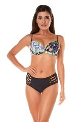 Стильный раздельный купальник с формованными чашками пуш-ап на каркасах. Лиф с ярким морским принтом, завязывается на спинке, бретели регулируются по длине и отстегиваются. Плавки с высокой посадкой и декором в виде тонких перекрещенных тесемок. В комплекте: лиф, трусики.