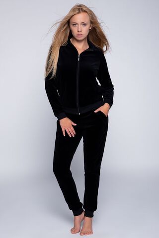 Стильный костюм Jennifer выполнен из мягкого велюра, состоит из кофты с длинным рукавом и штанов зауженного кроя с манжетой-резинкой по низу. Кофта на молнии, с воротником-стойкой и надписью на спине. Костюм дополнен карманами. В комплекте: кофта, брюки.