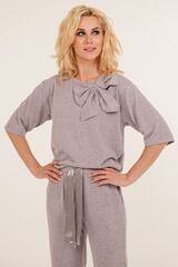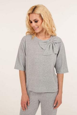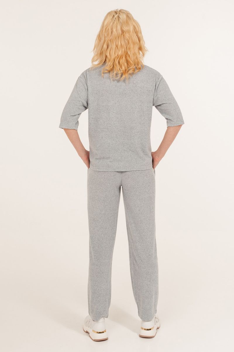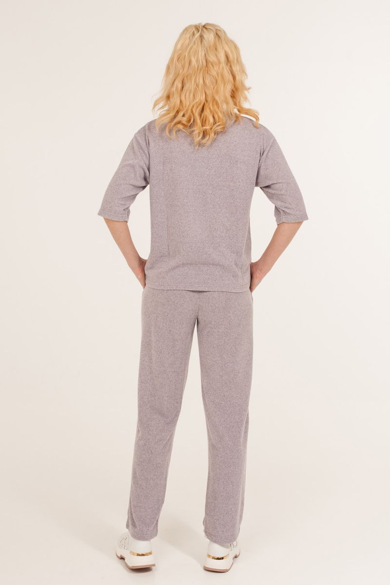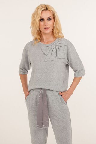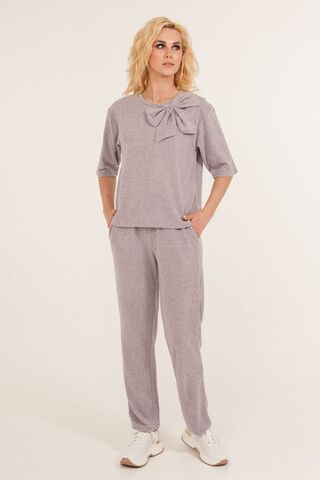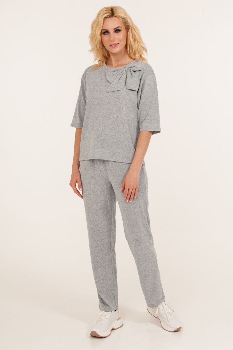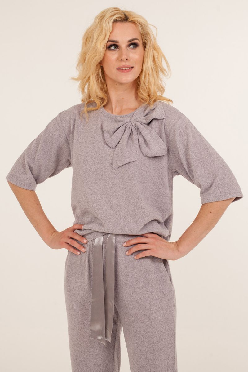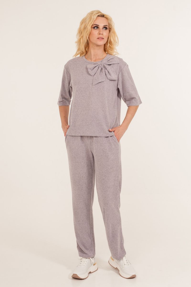 Модный женский костюм, выполнен из приятного для тела материала. Оригинальный крой. Топ с рукавами 3/4 украшен объемным бантом. Брюки прямого кроя. В комплекте: топ, брюки.