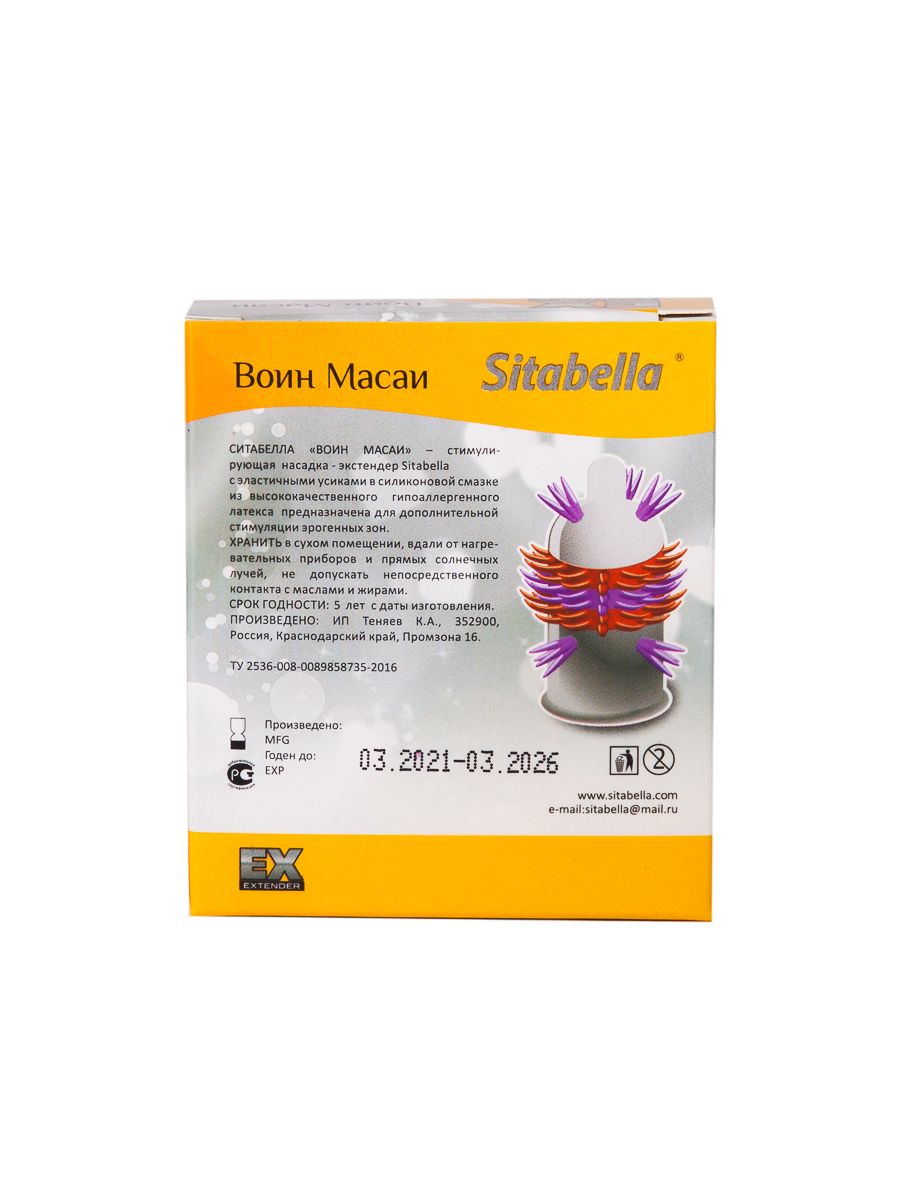 Стимулирующая насадка Sitabella Extender Воин Масаи. С эластичными усиками. Продукт не является изделием медицинского назначения! Одноразовая стимулирующая насадка не подлежит сертификации и обязательной маркировке, изготовлена по ТУ 2536-008-0089858735-2016, ТН ВЭД 4014100000.