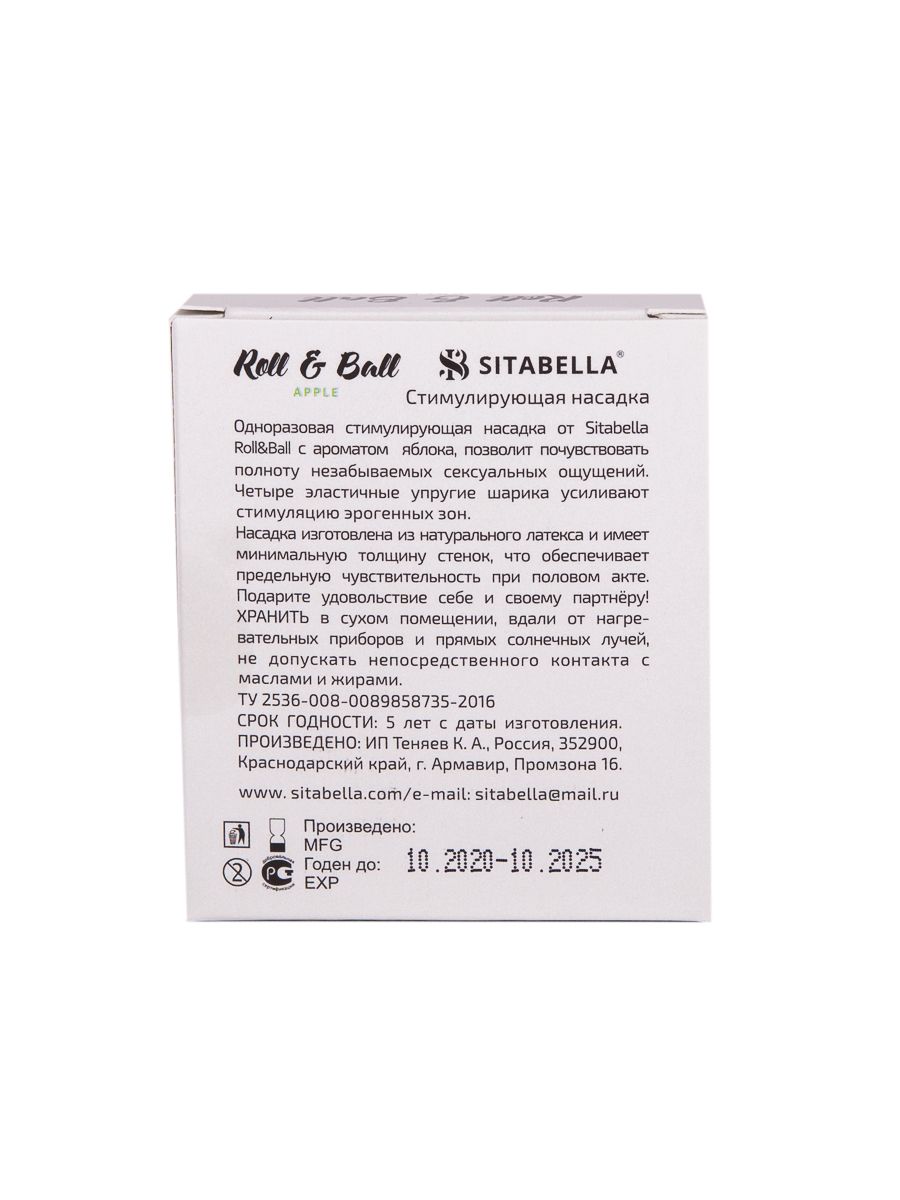 Roll & Ball – прозрачная зеленая стимулирующая насадка в виде презерватива с накопителем цилиндрической формы и пятью эластичными красными шариками. Насадка покрыта силиконовой смазкой с ароматом яблока, которая обеспечивает легкое и комфортное скольжение. Продукт не является изделием медицинского назначения! Одноразовая стимулирующая насадка не подлежит сертификации и обязательной маркировке, изготовлена по ТУ 2536-008-0089858735-2016, ТН ВЭД 4014100000.