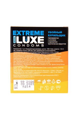 Сделать секс не только защищенным, но и экстремально восхитительным поможет презерватив Luxe Extreme «Убойный бурильщик». Активная стимуляция с помощью зубчиков и усиков даст дополнительный импульс к достижению мощного оргазма. Самые чувствительные эрогенные зоны получат прицельное воздействие, чтобы гарантированно расширить границы привычных ощущений. Приятный аромат тропических фруктов дополнит чувственное удовольствие. Номинальная ширина - 52 мм.