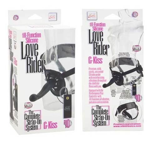 Страпон унисекс Love Rider G-Kiss – универсальный страпон на регулируемых ремнях, снабжен надёжным металлическим кольцом-креплением, эргономичным вибратором премиум класса из шелковистого, гладкого, гибкого, но упругого материала без запаха. Вибратор легко снимается, оснащён присоской, поэтому им можно пользоваться отдельно, вибратор мультифункциональный – 10 функций вибрации, пульсации и движения, оборудован выносным пультом, функцией авто включения/выключения, а также функцией запоминания последней выбранной программы. Длина вибратора - 16 см.