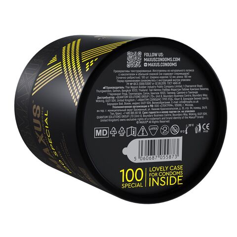 Не упусти возможность насладиться столькими моментами, сколько вмещает в себя тубус MAXUS So Much Sex Special! Тубус MAXUS So Much Sex Special - это настоящее точечно-ребристое удовольствие в 100 кратном формате! 100 текстурированных презервативов обеспечат надежную защиту, а благодаря запатентованной технологии ULTRASENSETEX, подарят более естественные ощущения! Бесплатно с каждым тубусом – металлический кейс - стильная кондомница для хранения и переноски презервативов MAXUS в одном из эксклюзивных цветов! Презервативы текстурированные из натурального премиального латекса с гиппоалергенной силиконовой смазкой и накопителем. Невероятный тубус на 100 штук! Номинальная ширина - 52 мм.