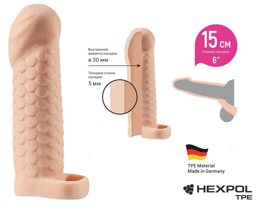 Телесная рельефная насадка-удлинитель KLEON с подхватом - 15 см.