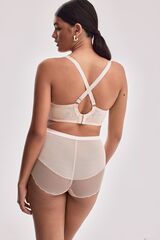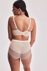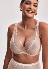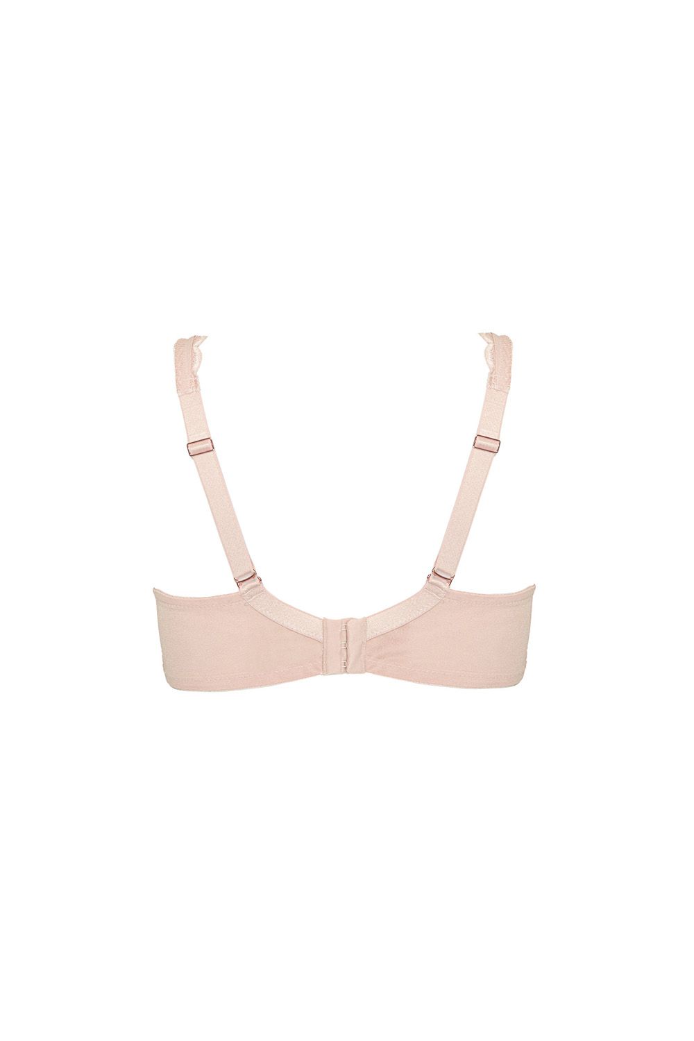 Бюстгальтер Chita M с мягкими чашечками на косточках, чашки шитые, покрыты кружевом, продублированы телесной тканью, с дополнительными боковыми поддержками. Бретельки регулируются по длине, отстёгиваются на спинке. На спине застёжка на удлинитель, количество крючков в ряду застёжки увеличивается пропорционально размеру бюстгальтера.