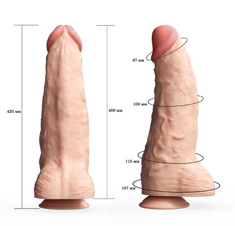 Искусственный фаллос гигантского размера. Фаллоимитатор из SEBS (TPR/TPI) и медицинского вазелинового масла. Изделие имеет многослойную структуру. Наружная оболочка сделана из мягкого материала NEOSKIN. Внутри каркас из более плотного, эластичного полимера. Фаллоимитатор полнотелый. Конусная форма с массивной нижней частью на мощной присоске. Головка относительно пропорций изделия уменьшена. Рабочая длина - 33 см.