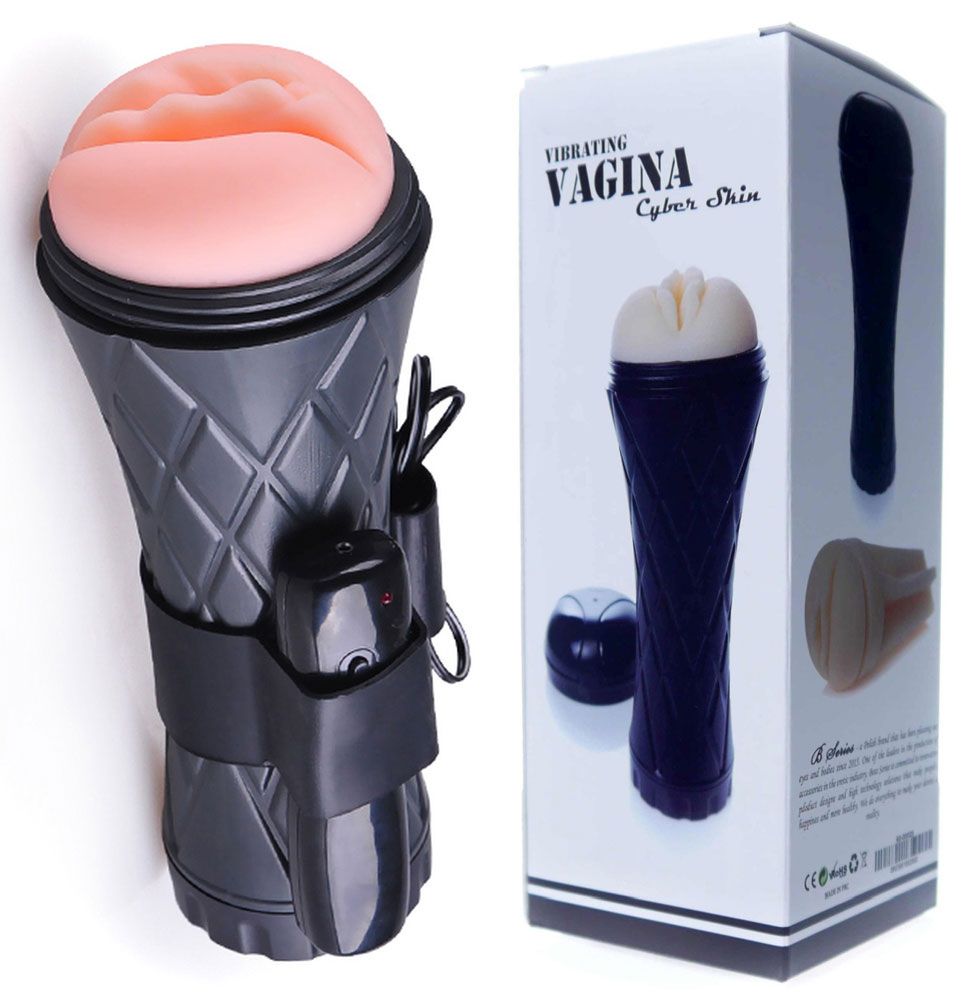Телесный мастурбатор-вагина в черной колбе с вибрацией