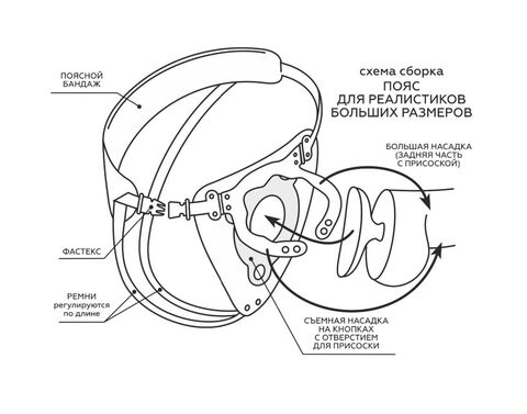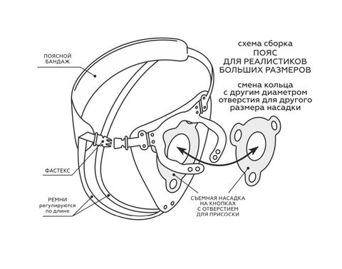 К поясу прилагается съемное кольцо на кнопках, благодаря чему пояс становится универсальным под любой размер присоски. Учитывая, что хомутик на корпус изделия также имеет кнопки для изменения диаметра, то такой пояс можно использовать в очень широком диапазоне размеров.