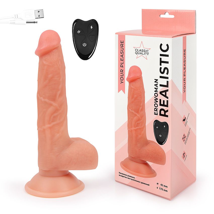 Реалистичный вибромассажёр c разнообразными режимами возвратно-поступательных движений. Присоска позволит прочно закреплять изделие на ровной поверхности в горизонтальном или вертикальном положении. В комплект входит USB провод для зарядки секс-игрушки, дистанционный пульт, батарейка для пульта. Для включения/выключения вибромассажёра необходимо нажать и две секунды удерживать кнопку на его корпусе. Переключение возвратно-поступательных режимов осуществляется с помощью краткого нажатия на ту же кнопку. Для управления работой эротического аксессуара с помощью пульта, необходимо сначала нажать кнопку включения/выключения на его корпусе, а затем использовать кнопки на самом пульте. Выключить секс-игрушку также можно с помощью соответствующей кнопки на пульте. Рабочая длина - 17 см.