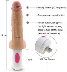 Вибромассажер с ротацией выполнен из ТПЕ. Функция с подогревом до 42 градусов, нажатие отдельной кнопкой. Перезаряжаемый. Вращение вибратора на 360 градусов. Водонепроницаемый. Рабочая длина - 12,5 см.
