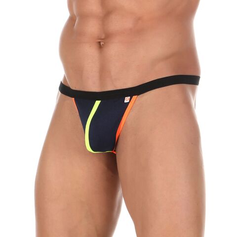 Темно-синие сексуальные трусы-стринги с оранжевой и салатовой окантовкой.