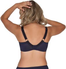 Бюстгальтер A-71 M в темно-синем цвете выполнен на косточках, с боковыми поддержками, чашки мягкие, шитые из гипюра с цветочным рисунком, продублированы телесной сеткой, верх чашек из сетки и кружева с «ресничками», спинка из плотной сетки. Бретельки не съемные, регулируются по длине, на спине застёжка - удлинитель на крючках, фурнитура металлическая крашеная.