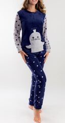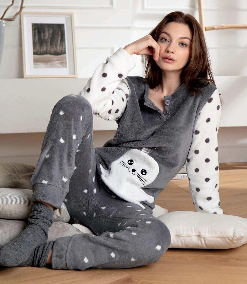 Домашний костюм из легкого дышащего пушистого корал-флиса: блуза с контрастными набивными рукавами, застежкой на пуговицах в вырезе горловины и аппликацией и набивные брюки. Рукава блузы и вырезы брюк отделаны манжетами. В комплекте: блуза, брюки.