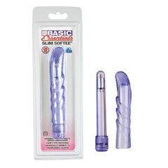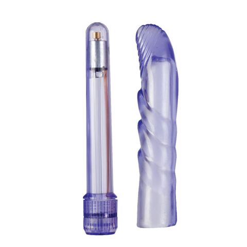 Тонкий пластиковый вибратор фиолетового цвета с мягкой насадкой в комплекте с загнутым кончиком. Вибромассажер с насадкой из TPR, имеющей неровную поверхность и рефленую головку, с легкостью найдет точку G и другие труднодоступные эрогенные зоны Вашего тела. В комплекте: вибромассажер, насадка.