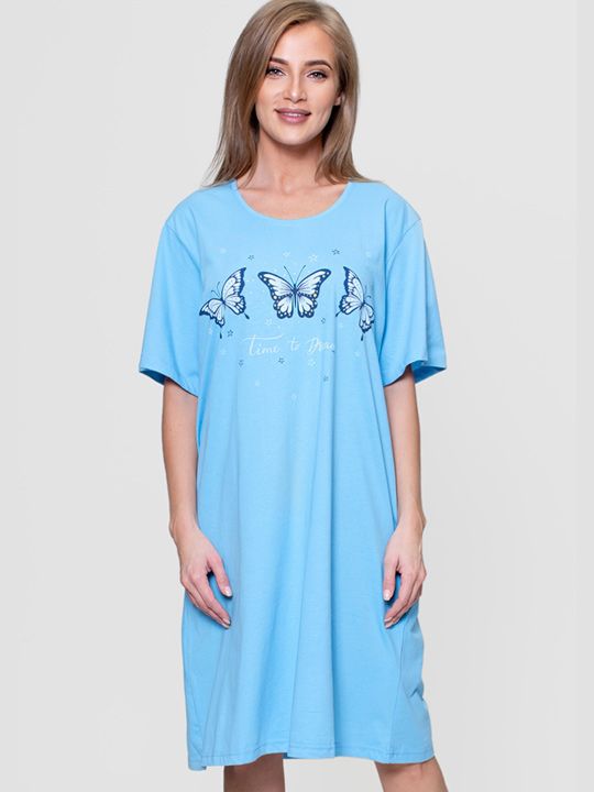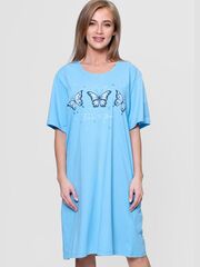 Трикотажная сорочка из однотонной ткани, с коротким рукавом, с принтом впереди.