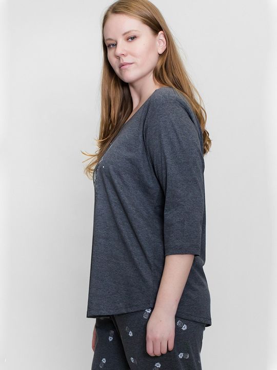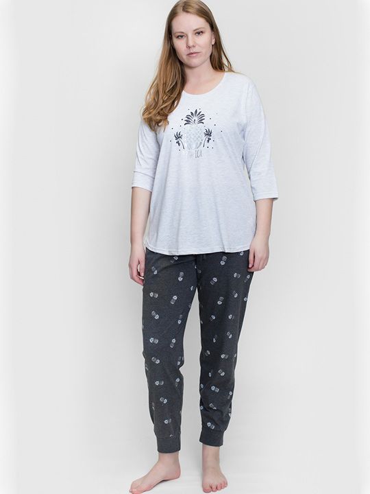 Трикотажный комплект. Футболка из однотонной ткани с принтом и с длинным рукавом, брюки свободного покроя в мелкий рисунок на манжете. В комплекте: футболка, брюки.
