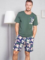 Комплект с шортами и футболкой с небольшим принтом на груди, с короткими рукавами, из трикотажного полотна. В комплекте: футболка, шорты.