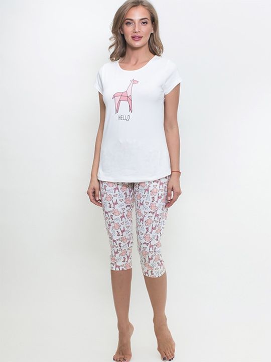 Комплект из двух предметов. Верх - футболка с круглым вырезом и укороченными рукавами. Украшена принтом с жирафом на груди. Низ комплекта - удобные капри с узором по всему полотну. Модель дополнена карманами по бокам и эластичным поясом на талии. В комплекте: футболка, капри.