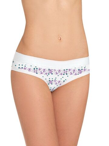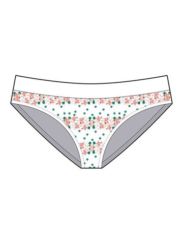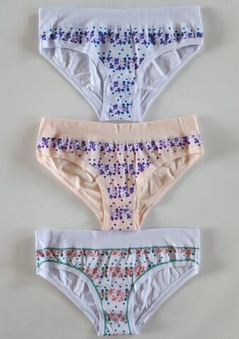 Трусики-боксерино с широкой резинкой и средней линией талии. Три дизайна: 1) белые трусики с синим горохом и цветами 2) белые трусики с зеленым горохом и цветами 3) бежевые трусики с горохом и цветами