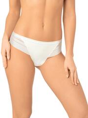 Трусы- бразилиана со средней линией талии. Передняя деталь выполнена из мягкой микрофибры, задняя деталь - из декоративного полотна с чередующимися полосками разной ширины. Спереди вырез ножки обработан тонкой тесьмой. По талии пришита деликатная эластичная тесьма. В изделии отсутствуют боковые швы, что делает его максимально комфортным и незаметным под одеждой.