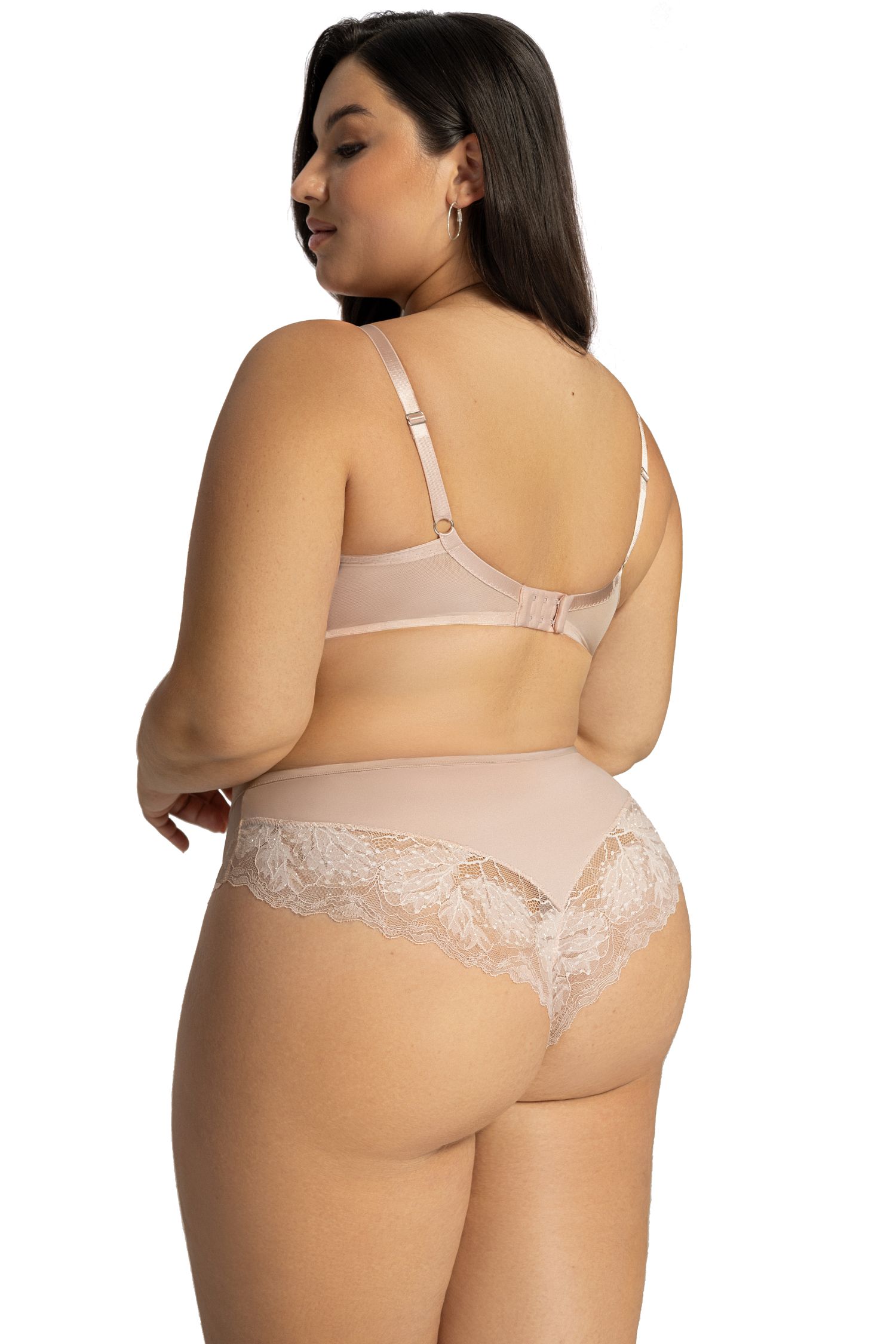 Трусики-бразилиана со средней линией талии 2155 Fiesta выполнены в пудровом цвете shimmer: спинка из эластичного трикотажного полотна, спереди из сетки и кружева, проймы ног из кружева. Восхитительное, мерцающее серебристым, нежно-розовое кружево изящно смотрится на загорелой коже. Ластовица проложена 100% хлопком.