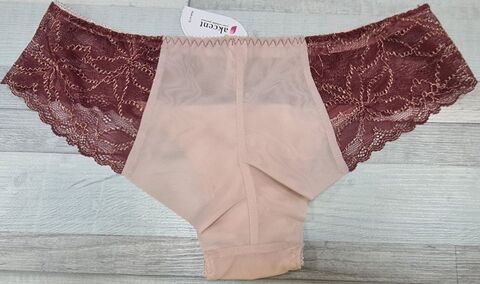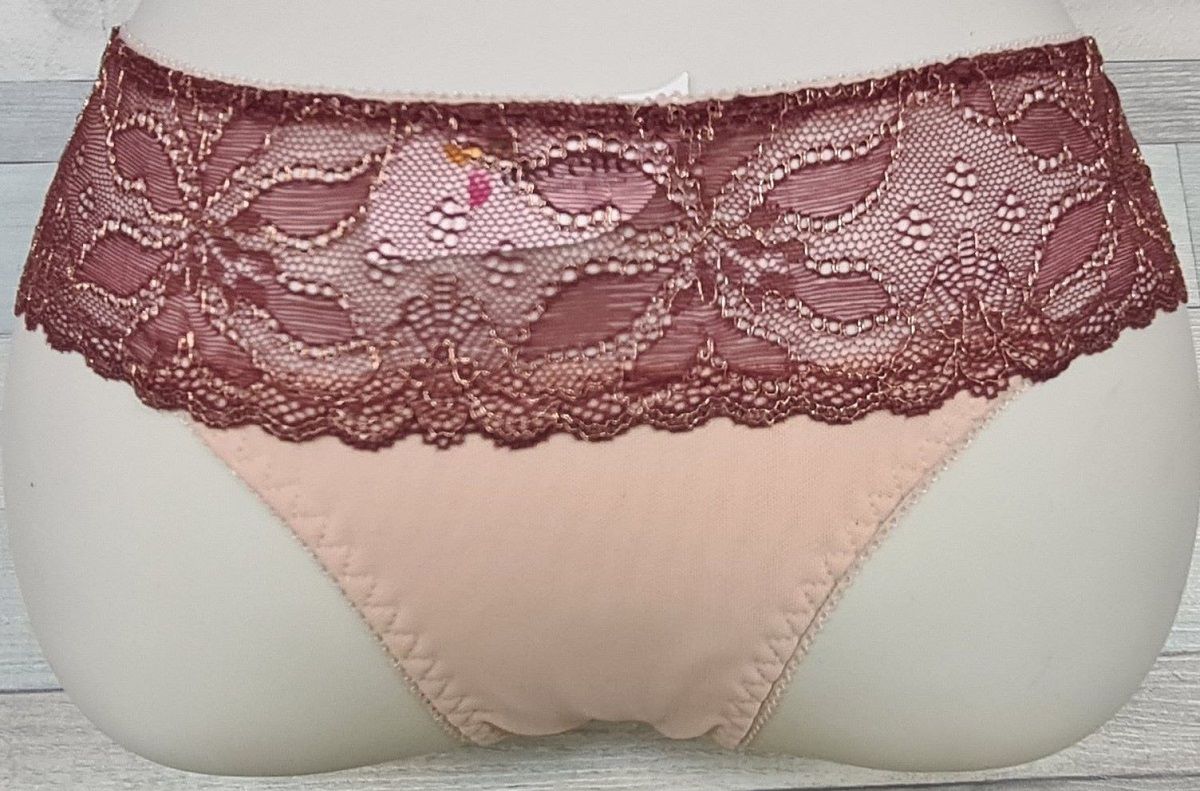 Трусики-бразилиана выполнены из кружева с люрексом, спереди вставка из телесной сетки продублирована хлопковым телесным трикотажем , резинки телесного цвета, на спинке вставка из телесной сетки, сложенной вдвое. Ластовица проложена 100% хлопком телесного цвета. Идеальный вариант для повседневной носки.