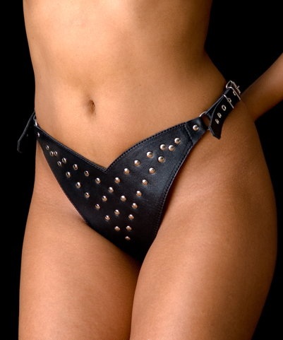 Трусики с клёпками из лакированной чёрной кожи.