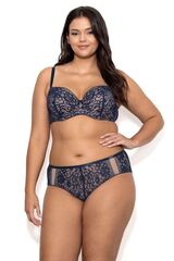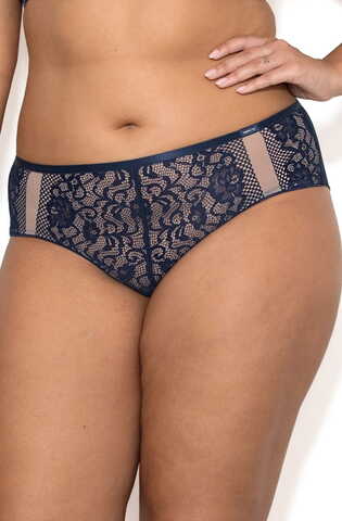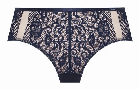 Трусики-шорты спереди из кружевного полотна, продублированного эластичной телесной сеткой, спинка из сетки, сложенной вдвое. Ластовица проложена 100% хлопком.