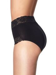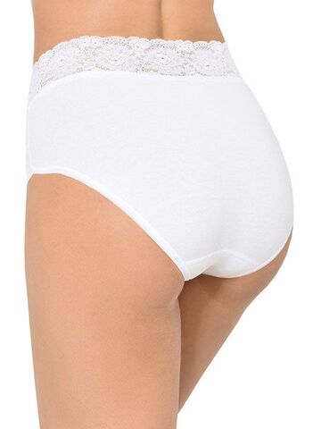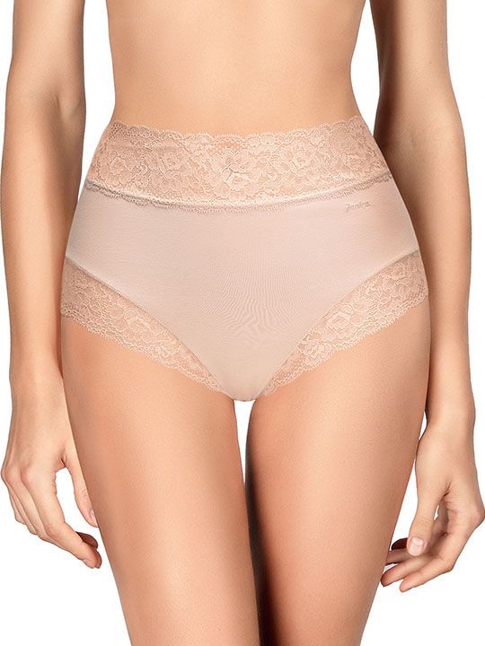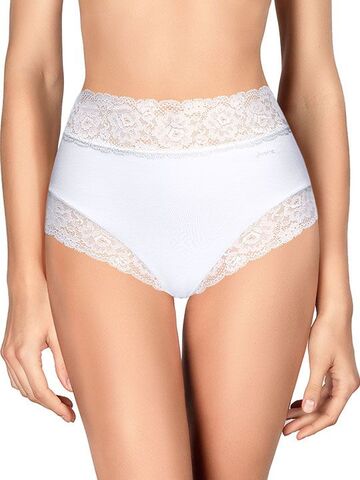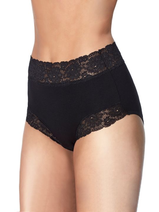 Трусики-слип с высокой линией талии из хлопковой ткани с особым покрытием Silk touch, декорированные кружевом. Высота бочка 14 см. Резинка на талии и линия открытия ноги спереди выполнено из мягкого суперэластичного кружева. Ластовица выполнена из уникального хлопкового материала. Материал: ALGODON 66%, POLIAMIDA 24%, ELASTANO 10%