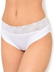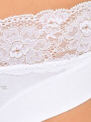 Трусики-слип со средней линией талии из хлопковой ткани с особым покрытием Silk touch, декорированные кружевом. Высота бочка 8 см. Линия открытия ноги спереди обработана мягкой окантовкой, сзади плоской эластичной резинкой. Роль резинки на талии выполняет мягкое суперэластичное кружево. Ластовица выполнена из уникального хлопкового материала.