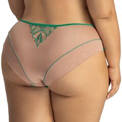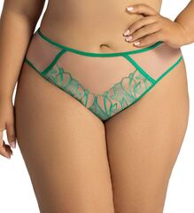 Трусики-слипы 2161 Moss выполнены в зеленом цвете спереди из чувственного тюля, богато расшитого весенними листьями, спинка из трикотажа и сетки, сложенной вдвое, с V-образной вставкой из сетки с вышивкой. Ластовица проложена 100% хлопком телесного цвета.
